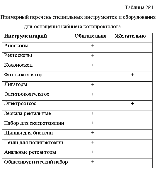 Для эффективной лечебной работы в современных экономических условиях и оказания качественных медицинских услуг колопроктологический кабинет должен быть оснащен специальным диагностическим и лечебным оборудованием (см.таб.№1 ).