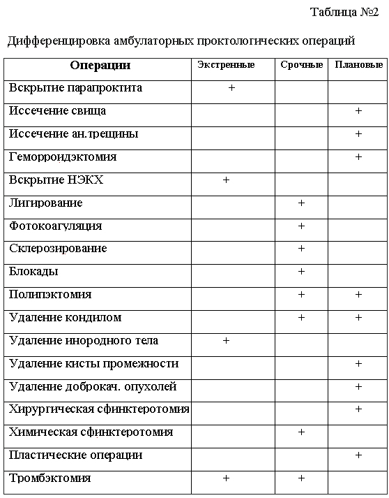 Все амбулаторные проктологические операции мы разделили на экстренные, срочные и плановые. К экстренным мы отнесли операции не нуждающиеся в тщательной предоперационной подготовке больного и медперсонала и требующие немедленного хирургического вмешательства.