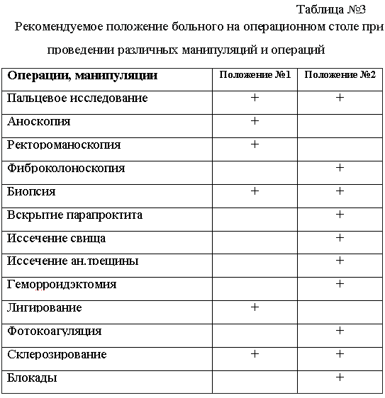В зависимости от вида операции или проктологического обследования больной занимает ту или иную позицию (см.табл.№ 3)